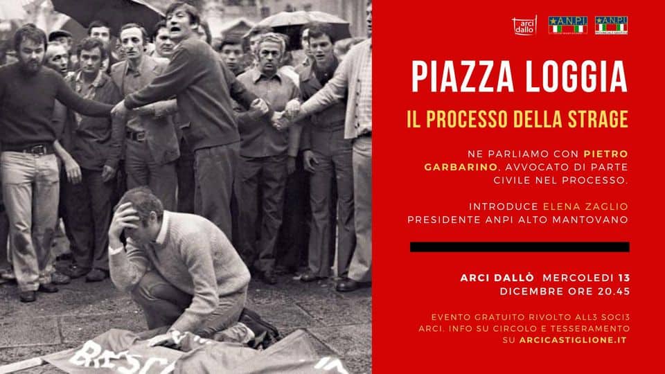 L'evento PIAZZA LOGGIA, il processo della strage. Con Pietro Garbarino, avvocato di parte civile – Arci Dallò inizierà mercoledì 13 Dicembre 2023. Controlla l'orario di inizio.