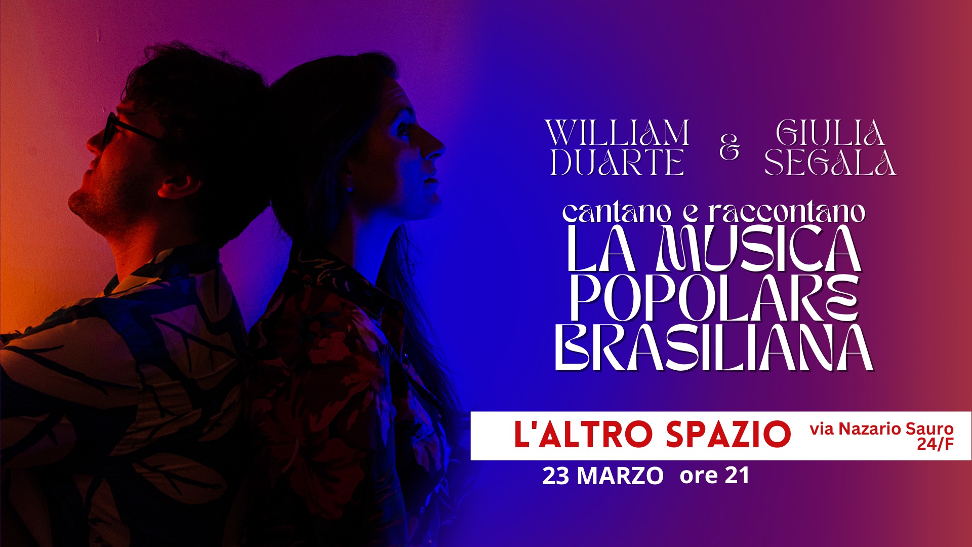 Gli organizzatori dell'evento "Spazi Migranti Giulia Segala & William Duarte (Musica Popolare Brasiliana)" sono L'Altro Spazio e William Duarte.