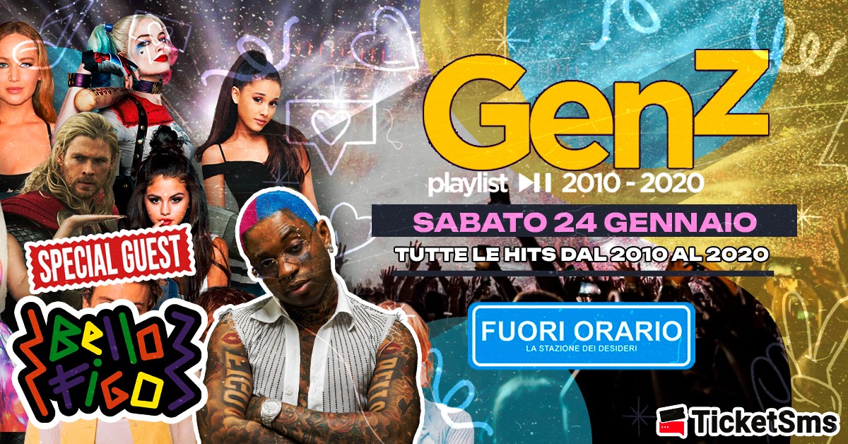 TICKET ONLINE RIDOTTI 10 EURO + dp link qui e in bio: https://www.ticketsms.it/event/Gen-Z-Playlist-2010-2020-Special-Guest-Bello-Figo-Gattatico-Fuori-Orario-24-01-2026