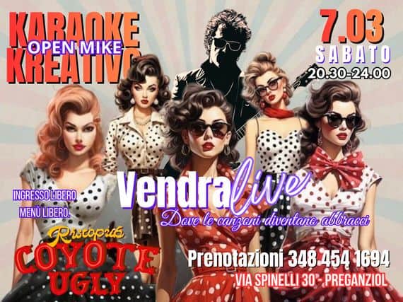 In un'unica data, l'evento "Open Mike Karaoke Kreativo Con Vendra Live" si è tenuto sabato 7 marzo 2026 dalle ore 20:30 alle ore 23:59.