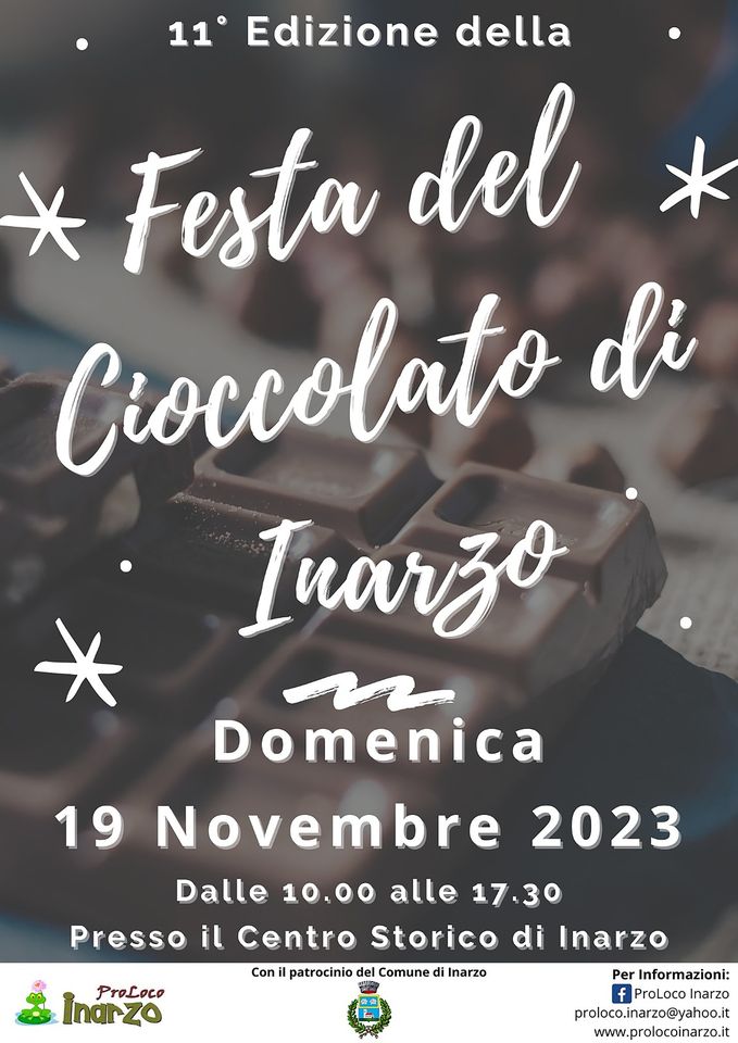 L'evento Festa del Cioccolato 2023 11° edizione inizierà domenica 19 Novembre 2023. Controlla l'orario di inizio.