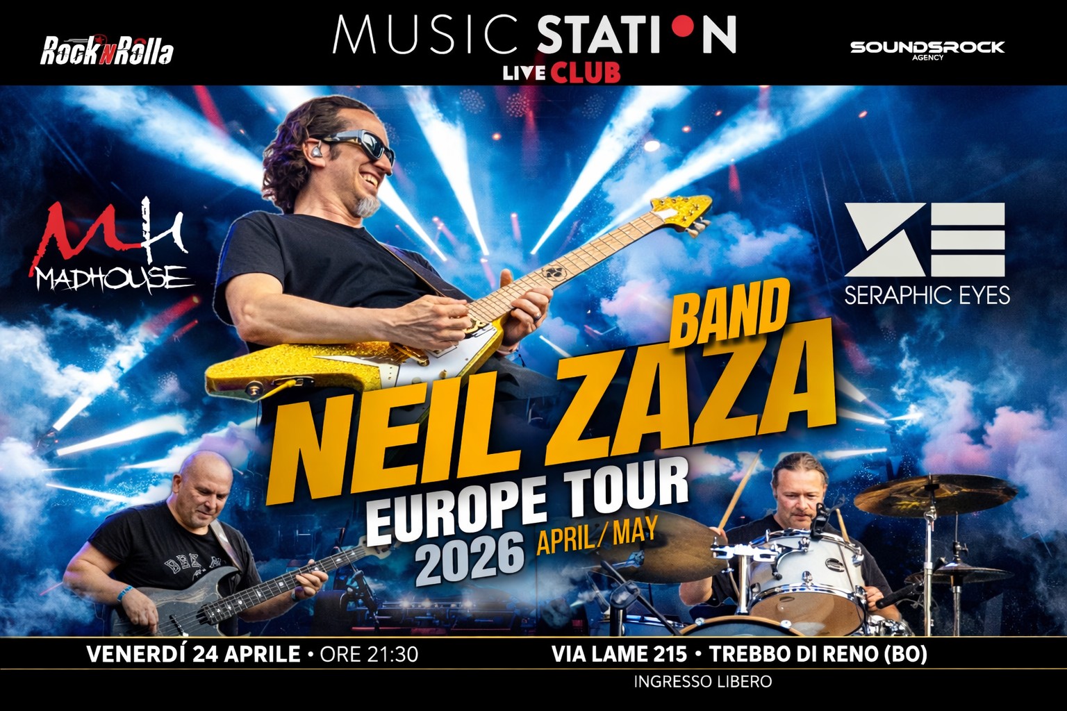 Gli organizzatori dell'evento "NEIL ZAZA – European Tour 2026 Madhouse Seraphic Eyes @Music Station Bologna" sono Rocknrolla Eventi, Neil Zaza, SoundsRock Agency, Music Station, Marc Magnus e MadHouse Rockband.