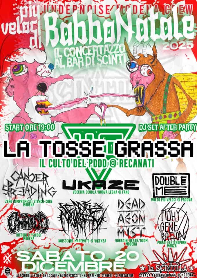Gli organizzatori dell'evento "Più Veloce Di Babbo Natale 2025" sono Undernoise Modena Crew, Cancer Spreading, Here And Now Records, Dead Aeon Mist e La Scintilla.